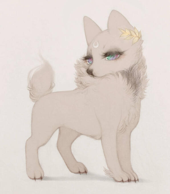 Once long ago, a single creature, a shade of beautiful milky white could be seen wandering hills of flowers. Her name was Luna. She'd do this often, feeling quite lonely for being without a companion for so long. Every day that passed only caused her to become more sorrowful, longing and wishing to not be so alone anymore.Eventually, on a rather lucky night, came the full moon. On this fated day, she shed tears like every other night. However, this particular night was different.Staring up at the moon, tears dripped down her fur falling onto a beautiful flower that suddenly, began to change. She noticed this, and taking a step back in shock, she watched. There, lying beneath her eyes was a pup. Small and frail it lifted its head to let out a small whimper, revealing its forehead marking. It looked very similar to Luna's.She laid by the pup, keeping it close as she lifted her head to stare up at the moon. She felt happy. All her sadness was lifted by this one night.
